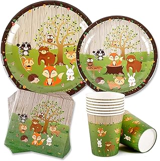 Amycute 44 -teiliges Kindergeburtstag Deko Set - Tiere Teller Becher Servietten Tischdeko für Geburtstag Kindergeburtstag Mottoparty, Tischdeko Partygeschirr Set für 8 Personen.